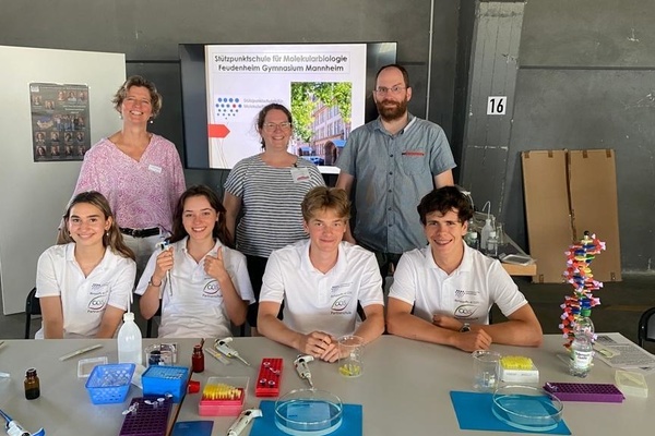 Am 19.07.2023 war es so weit und die Schülermentor:innen des FGM durften einen BUGA-Stand auf dem Spinelli-Gelände beim „Treffpunkt Baden-Württemberg“ betreuen. Im Rahmen des „Jungforschertags“ gab es unterschiedliche Stände zum wissenschaftlichen Forschen an Schulen, MINT-Projekte aus Baden-Württemberg und vieles mehr. Beim Stand der Stützpunktschule für Molekularbiologie konnten Besucher:innen Mikropipetten kennen lernen, Agarosegele in Gelschlitten gießen, in sehr kleine Geltaschen pipettieren, Bio-Scrabble spielen oder auch durch ein Molbio-Domino neue Begriffe lernen. Ziel war es, unsere Arbeit als Stützpunktschule am FGM vorzustellen und Menschen für die Molekularbiologie zu begeistern.