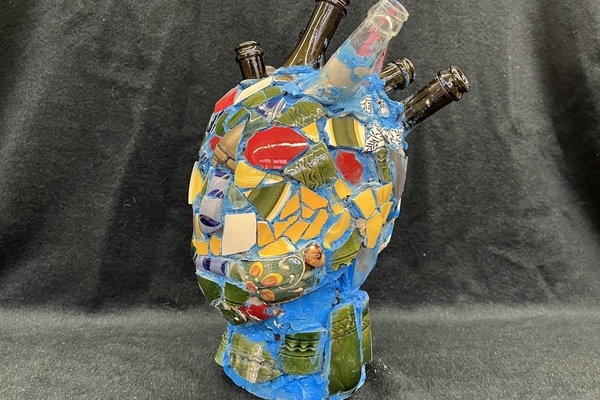 „Die Gedanken sind frei, wer kann sie erraten, sie fliehen vorbei wie nächtliche Schatten.“ – Diese Anfangszeilen des berühmten Liedes von Hoffmann von Fallersleben bildeten den Ausgangspunkt für die künstlerische Auseinandersetzung der SchülerInnen der Klasse 10c. Sie sollten passend dazu eine Büste erstellen.Tim Werners Kopfplastik ist ein eindrückliches Beispiel für eine fantasievolle und ausdrucksstarke Umsetzung der literarischen Vorlage. Die Gedanken scheinen den Kopf in alle Richtungen zu durchbohren, das Gesicht ist aufgesplittert in ein farbiges Mosaik.