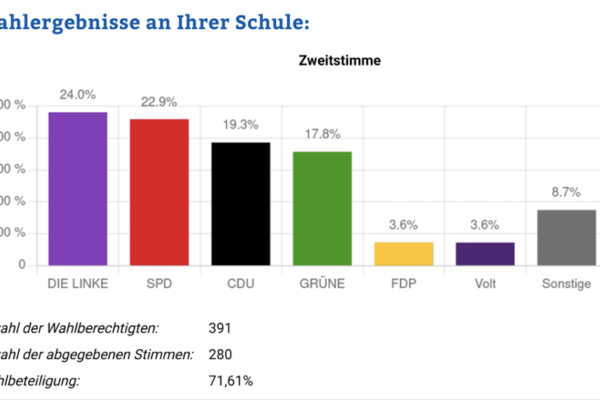 Aufgrund dessen, dass am Sonntag den 23.02.2025 die Bundestagswahlen waren, haben wir an unserer Schule eine Juniorwahl durchgeführt. Alle Schüler ab der 8. Klasse bekamen dafür eine Wahlbenachrichtigung und konnten mit Vorzeigen eines Ausweises ihre zwei Stimmen abgegeben. Einige Schüler nahmen mit Engagement daran teil.Folgende Ergebnisse sind dabei zu Stande gekommen: