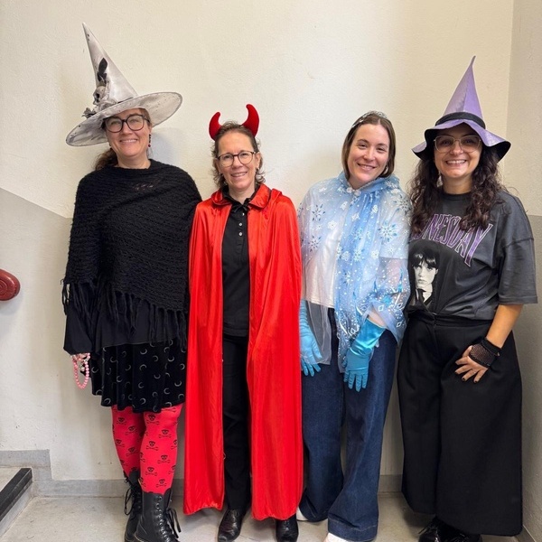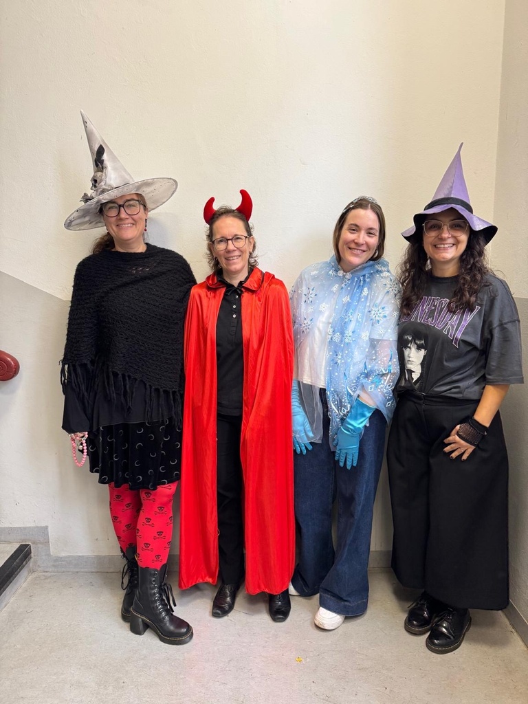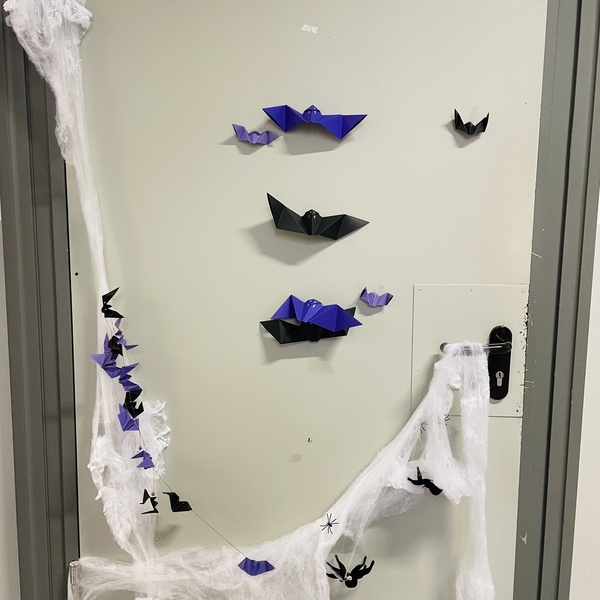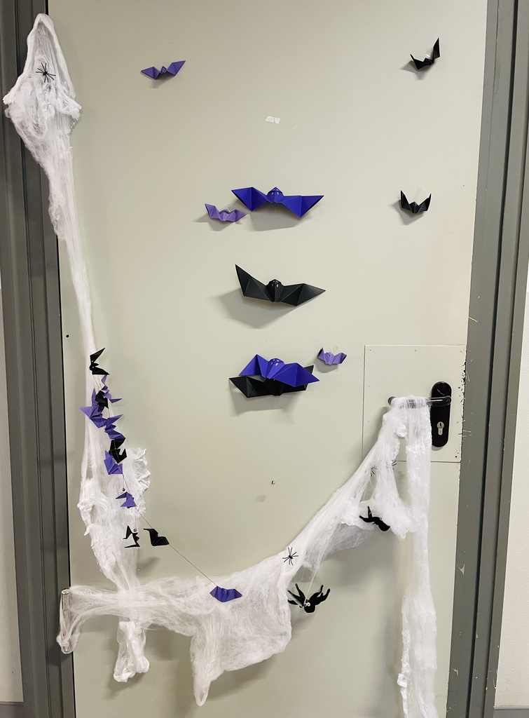 Am Donnerstag, den 23.10.25 war am Feudenheim Gymnasium Schauriges zu beobachten. Geister, Hexen und andere gruselige Gestalten pilgerten in der 10minuten-Pause zum Oberstufenraum. Dank den Origami-Künsten von Lennart Vorst aus der Klasse 6d warteten dort schaurig schöne Fledermäuse und andere Grusel-Dekoration. Außerdem lockte die Schüler nicht nur die aufwändige Dekoration, sondern auch Süßes oder Saures — aber nur für diejenigen, die auch wirklich gruselig verkleidet erschienen. Die vielen Geister und anderen Gestalten sorgten für eine ganz besondere Stimmung an unserer Schule, die die Vorfreude aller auf Halloween (und die Herbstferien) weckte!“ Auch einige Lehrerinnen waren im Halloweenkostüm gekommen.
