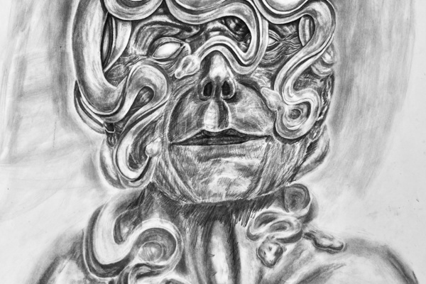 Die zeichnerischen Herausforderungen bei dieser Aufgabe sind komplex: In einer überlebensgroßen Darstellung sollte eine ausdrucksstarke, proportional richtige und durch differenzierte Graustufen plastisch erscheinende „Medusa“ gestaltet werden.