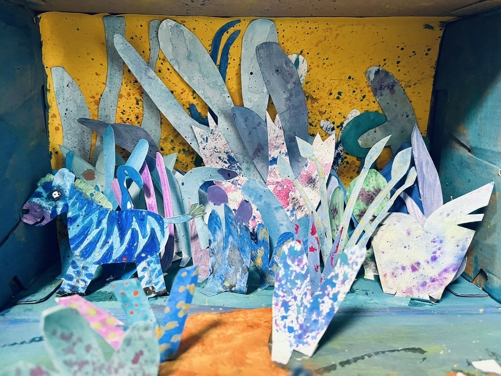 Kennt ihr das Blauland? Johanna König aus der Klasse 5D lädt die Betrachter dazu ein, in ihre fantasievolle Landschaft einzutauchen. Durch das Gestalten in einem Schuhkarton entsteht ein kleiner Raum, der wie eine Bühne funktioniert. Vorder-, Mittel- und Hintergrund sind deutlich zu erkennen und erzeugen Tiefe. Mit Wasserfarben hat die junge Künstlerin eine wundersame Welt aus verschiedenen Blautönen entstehen lassen, in der es exotische Pflanzen und sogar ein blaues Zebra zu entdecken gibt.